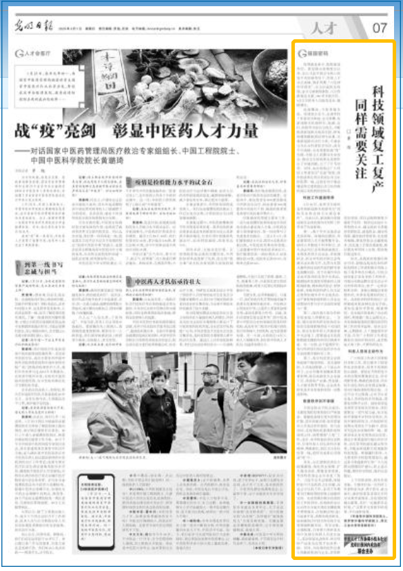 2020年3月1日,《光明日报》刊发中国科学院院士、俄罗斯外籍科学院院士、海角论坛 信息材料与纳米技术研究院学科带头人黄维院士署名文章,题为《科技领域复工复产同样需要关注》: