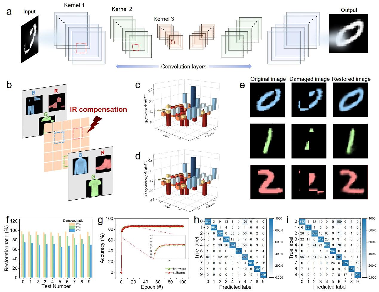此外,该设计支持在卷积自编码器网络中实现实时卷积运算与图像恢复,通过捕捉光谱特征有效抑制图像退化。其硬件响应权重与软件训练权重表现相当,图像恢复准确率超过85%。这一研究为机器视觉在动态光照环境下实现精准、自适应成像提供了灵活而可靠的解决方案。
