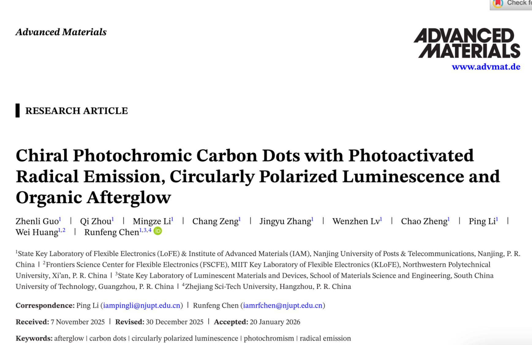 近日,柔性电子全国重点实验室黄维院士、陈润锋教授和李平副教授团队在自由基手性碳点长余辉领域取得重要进展。相关成果以“Chiral Photochromic Carbon Dots with Photoactivated Radical Emission, Circularly Polarized Luminescence and Organic Afterglow”为题发表在国际学术期刊Advanced Materials(《先进材料》)上。博士后郭振丽为第一作者,陈润锋教授和李平副教授为论文共同通讯作者。
