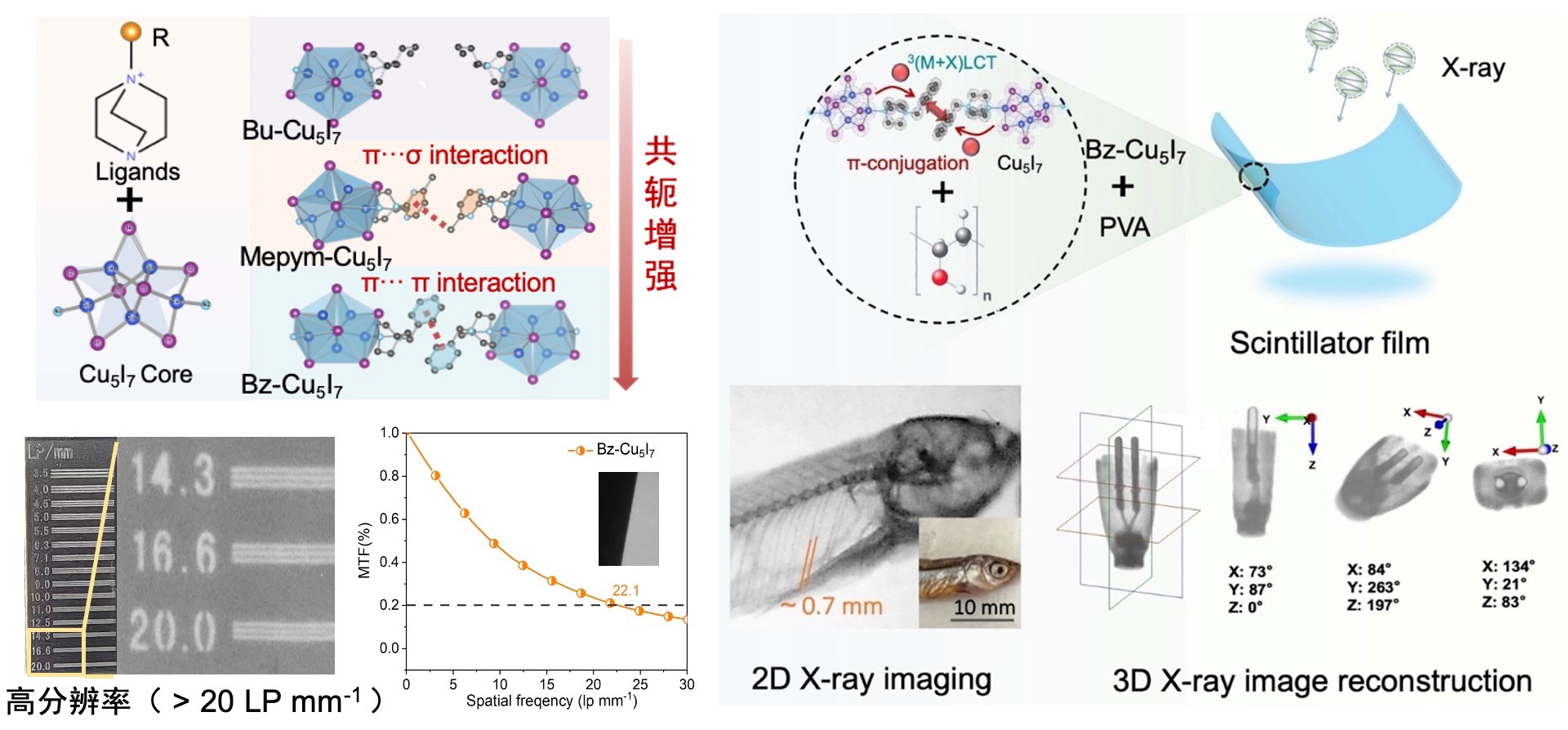 高分辨率三维CT成像的实现依赖于高性能X射线探测技术的进步。目前,传统闪烁体通常需要在较高辐射剂量下才能达到足够信噪比,其潜在的辐射安全问题限制了在医疗、安检及无损检测等领域的安全应用。因此,研发兼具高量子产率、高发光强度与低辐射阈值的新型闪烁体,成为推动X射线成像技术发展的关键课题。All-In-OneAIO)型碘化亚铜(I)配合物因其独特的“离子-配位”杂化结构,表现出优异的结构稳定性与性能稳定性,被视为极具前景的下一代闪烁体候选材料。尽管如此,该类材料在高能X射线向可见光的高效转换过程中,非辐射复合过程严重制约了其能量转换效率,影响成像灵敏度与分辨率。因此,有效钝化该类材料应用中的非辐射复合过程具有重要意义。