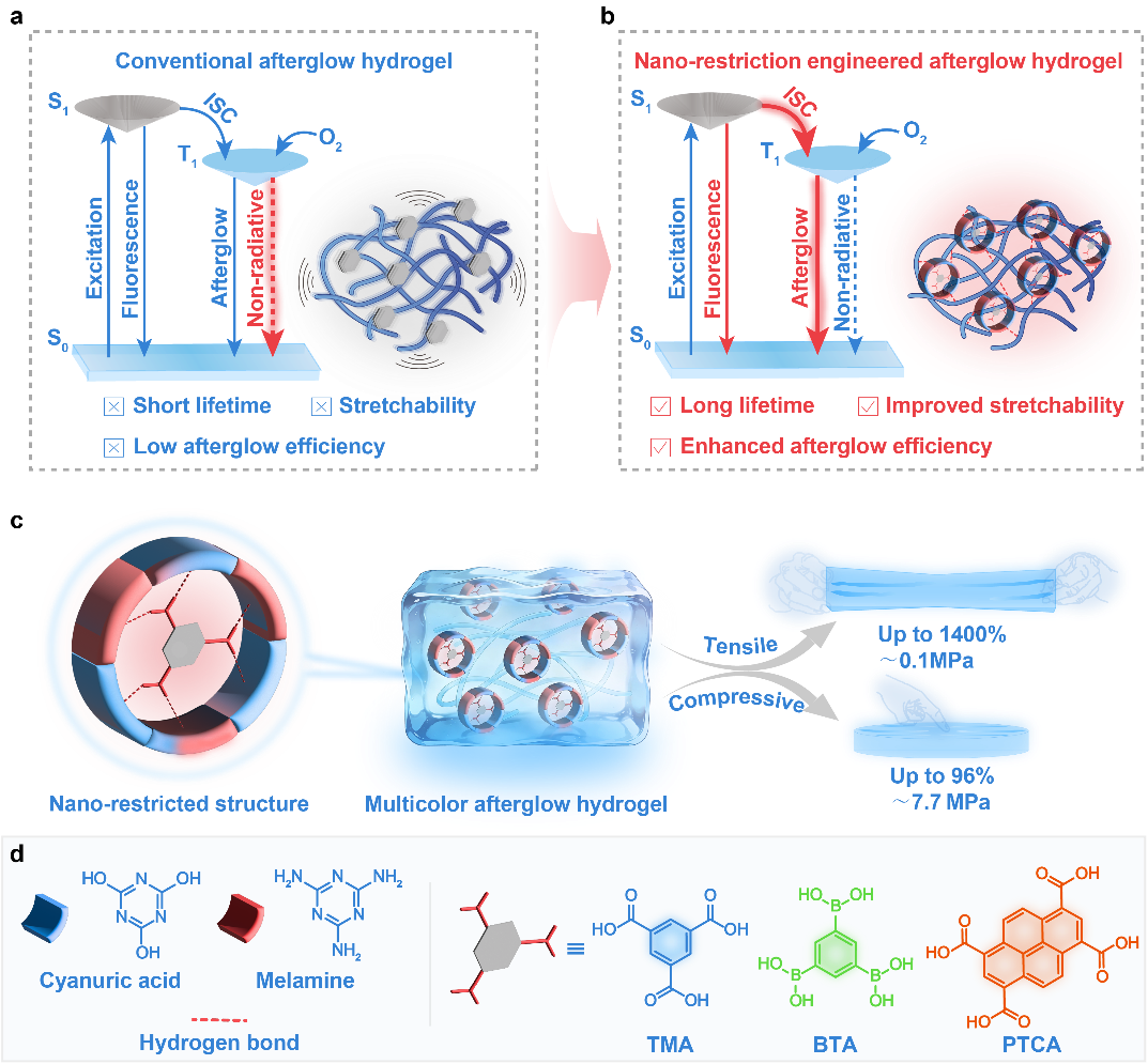 多色发光水凝胶作为一类极具潜力的软物质发光材料,在信息加密防伪、生物成像、智能传感、生物医用等前沿领域展现出广阔的应用前景。其中,有机余辉水凝胶可同时高效利用单线态与三线态激子,突破了传统荧光材料的激子利用限制,被视为新一代软物质发光平台的核心发展方向。然而,传统余辉水凝胶体系长期以来面临着难以突破的瓶颈。水凝胶富水、透氧的本征特性,会严重加速三线态激子的非辐射失活与碰撞猝灭。同时聚合物链段的运动也会加剧振动能量耗散。这两大核心难题,直接导致现有余辉水凝胶普遍存在余辉寿命短(大多不足1秒)、量子产率低(普遍低于10%)、发光光谱局限于蓝绿波段的问题,无法同时实现高效激子利用与优异的力学形变性能,严重制约了其实际应用。